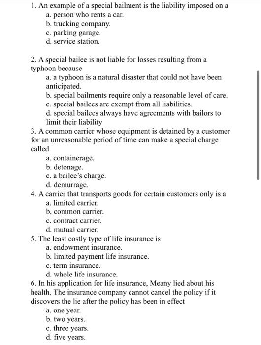 Solved 1 An Example Of A Special Bailment Is The Liability Chegg Com